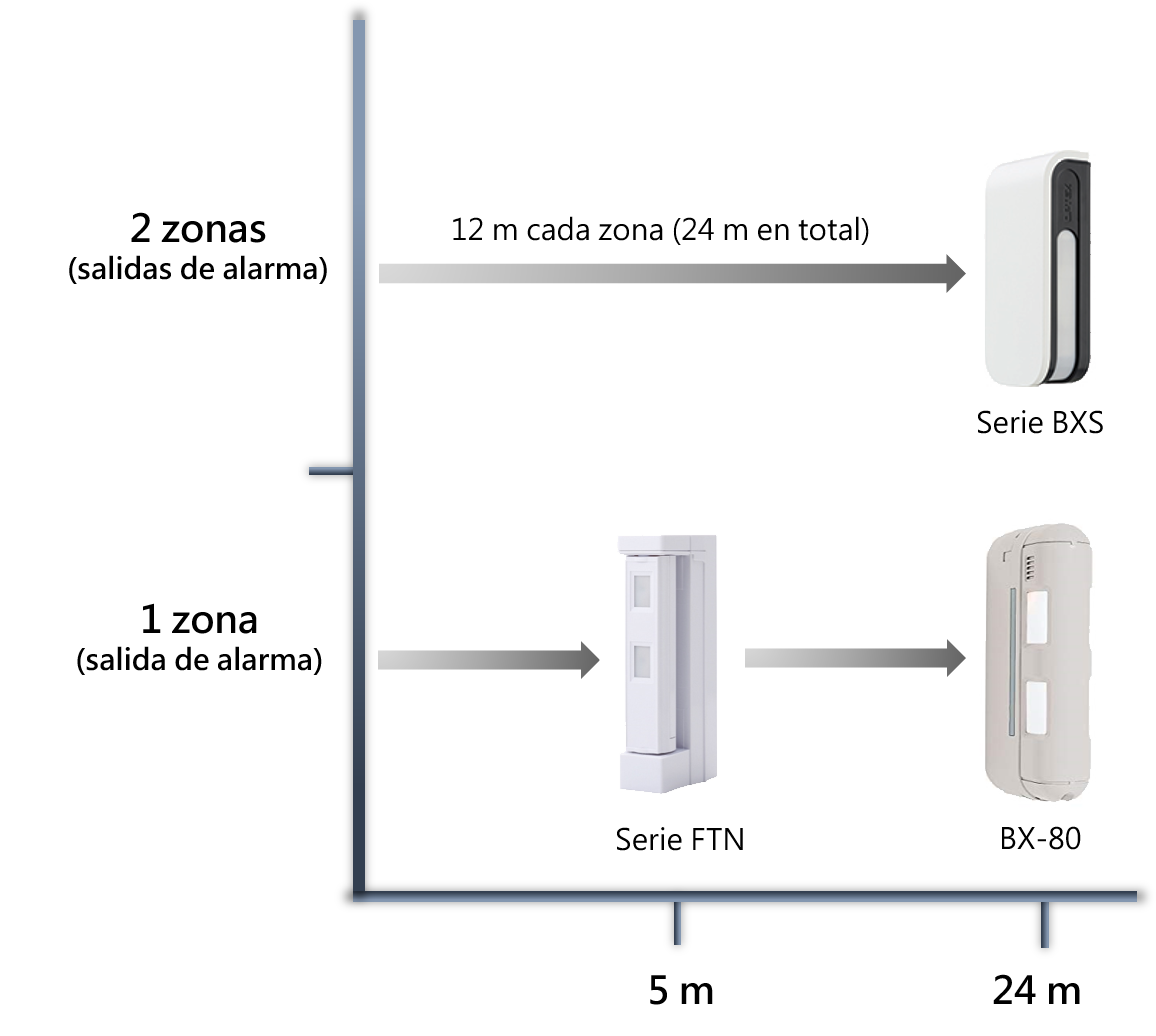 Sensores tipo cortinaLos sensores tipo cortina están indicados para protección de entradas, ventanas y fachadas de domicilios o edificios de oficinas. La serie FTN y la BX-80N ofrece un área de detección, mientras que la serie BX Shield (BXS) ofrece dos áreas de detección de 12 m cada una, y configuración independiente con salida relevo izquierda y derecha además de contar con carcasas de distintos colores para adaptarse mejor al diseño del edificio. | ||