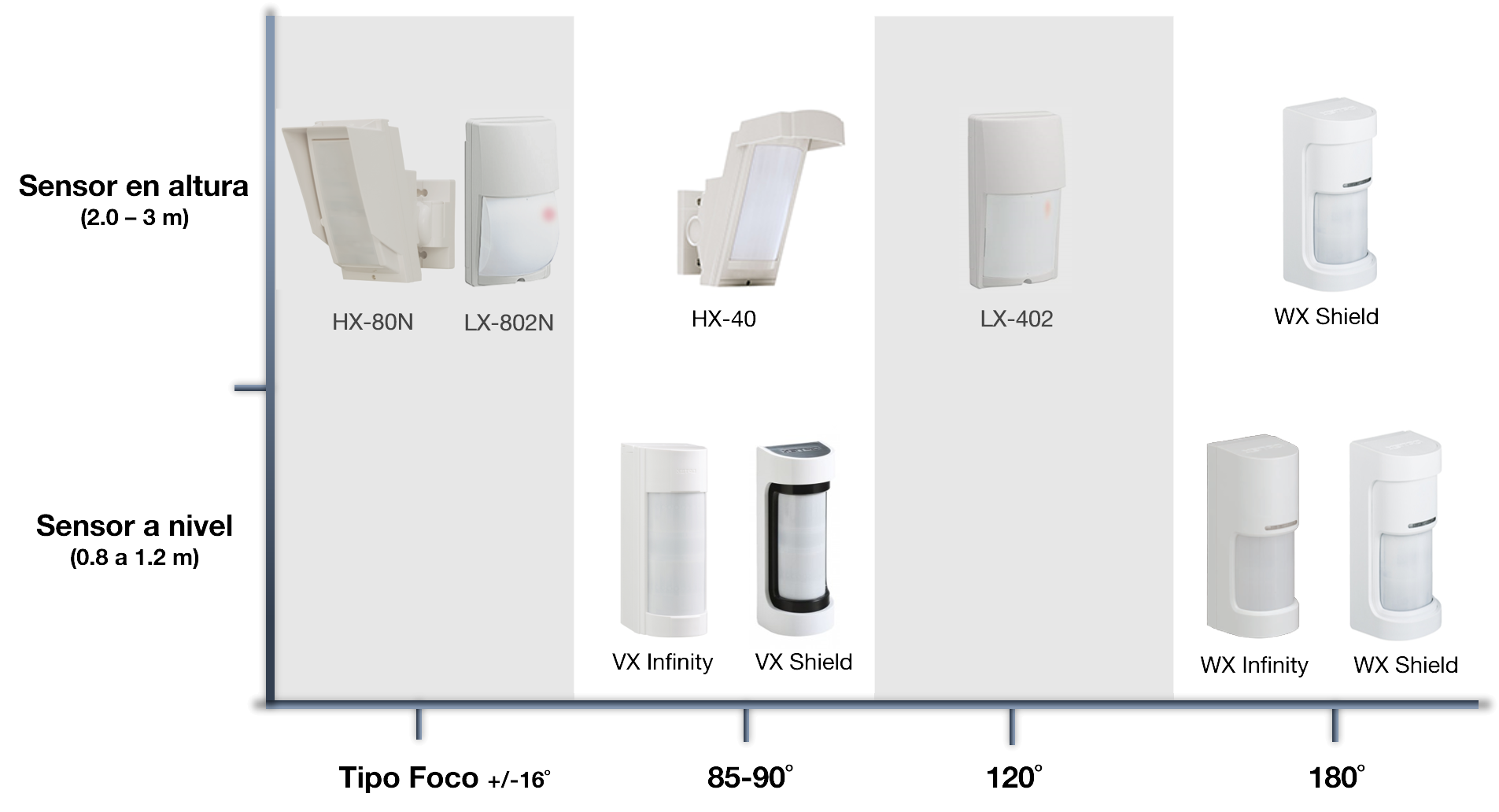 La serie VX Infinity (90 grados, 12m) es nuestro sensor referencia para la detección en exteriores por ser el sensor de exterior más vendido. La familia de sensores VX se completa con el VX Shield, sensor que actualiza la versión de firmware de detección además de contar con distintas carcasas en color blanco o blanco y negro, para adaptarse mejor al diseño del edificio. En 2019 lanzamos la serie WX que introduce los sensores panorámicos de 180 grados: La serie WX Infinity, sensor doble de 90 grados izquierda/ derecha con configuración y salida de relevo independiente, orientado a aquellas instalaciones de altura media. La serie WX Shield aporta nuevas funcionalidades a la familia WX como es la posibilidad de instalarse a 2 metros de altura, ideal para evitar vandalismo, la doble tecnología, además de una función de operación día/noche.