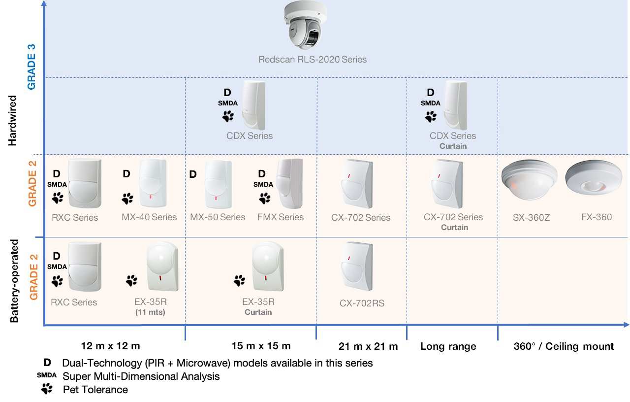 Our wide range of indoor sensors benefit from our sensing analytics and provide very reliable detection. Many of our models will feature pet tolerance, Super Multi-Dimensional Analysis (SMDA Logic), double conductive shielding and a selection include dual-technology (PIR and Microwave). Selecting the right sensor is very important to achieve the best performance for the application and security system requirements. The following table offers a complete overview of our indoor sensors including the different types of connectivity, detection range and grading.