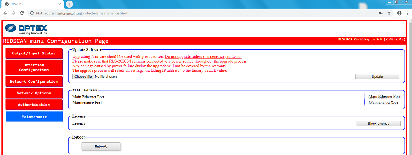 If the REDSCAN devices, either from the RLS-3060 or RLS-2020 series, are functioning correctly installing newer firmware is not recommended. In the event that new features are requested by customers, please get in contact with your local OPTEX Support Team who will advise whether a firmware upgrade is required to enable the additional features.
