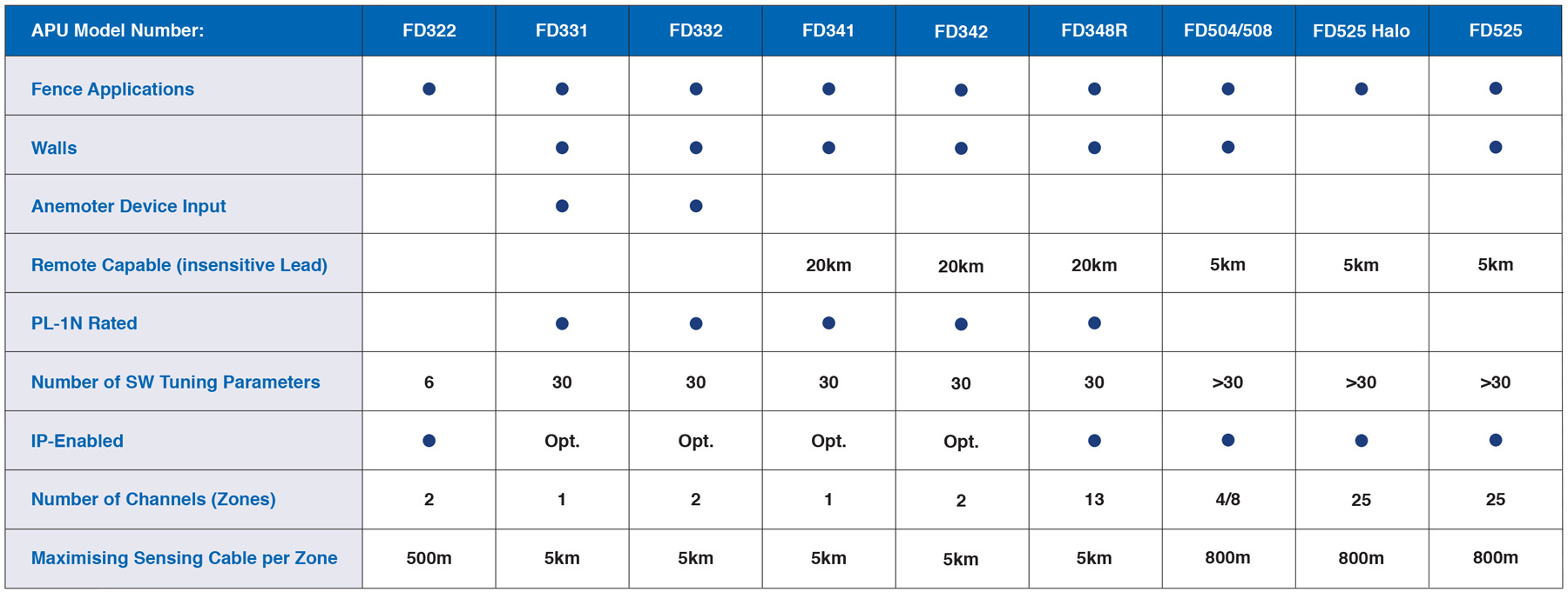 Here is a feature comparison table for all the fibre optic sensors that OPTEX via its company Fiber Sensys provides.