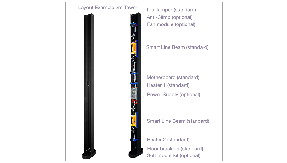 The first step is selecting the tower structures choosing between the height (height varies 0.5m -3m) and the design 180°(single sided) and 360° (back to back), free-standing or wall-mounted pre-built towers. The 2m tower can house up to 2 SmartLine beam units (to be ordered separately), and the 3m tower up to three beam units which can be either hardwired or battery operated (in this instance there is no heater installed and requires purchase of additional accessory).