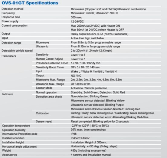 | el sensor del vehículo ViiK detecta vehículos pequeños y grandes dentro de un rango de 5.5 m sin usar ningún dispositivo en el suelo. No es necesario realizar trabajos de ingeniería civil, lo que hace que la instalación no sea perjudicial, es un reemplazo ideal para el circuito de inducción en áreas difíciles de excavar. La calibración se realiza fácilmente mediante el ajuste de distancia rápida y de sensibilidad. | la tecnología utilizada en el sensor de automóvil OVS-01GT es una combinación de microondas y ultrasonido. El sensor de microondas puede detectar la presencia de un vehículo basado en FMCW (Frequency Modulated Continuous Wave). Esta tecnología opuesto a los sistemas de detección de vehículos basados en video no se ve afectado por las condiciones de iluminación. | el ViiK OVS-01GT ha sido diseñado para activar el activador de una puerta automática, barrera o puerta industrial usando una salida de relé. El detector del vehículo proporciona una detección confiable incluso en entornos hostiles como el polvo, la lluvia y la nieve; tiene un calentador incorporado que permite un rango de operación de hasta -30 grados Celsius. Nota: Este es un sensor de activación y no un sensor de seguridad. |