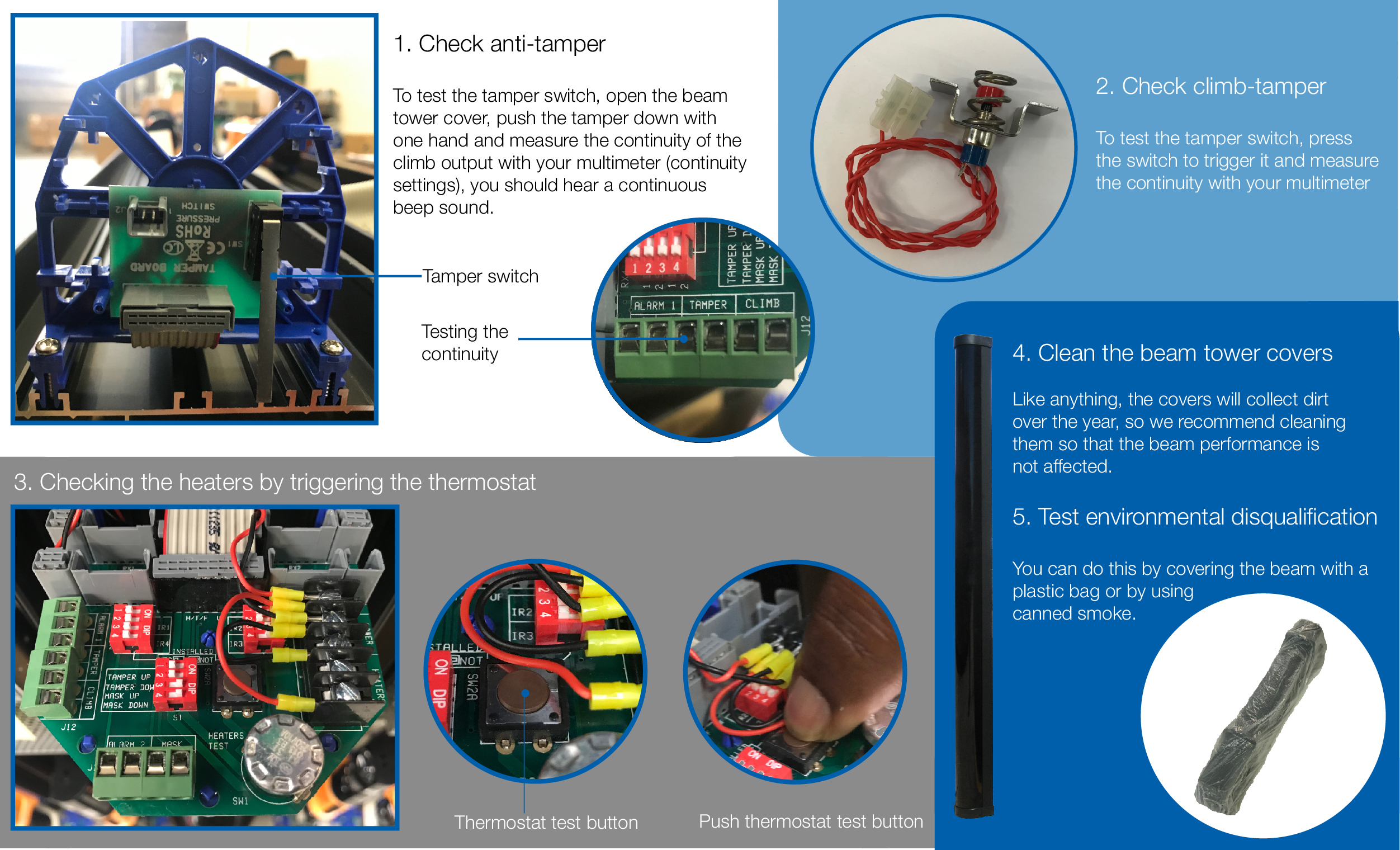 The best way to check is to open the cover, push the tamper switch while measuring the continuity loop with your multimeter. You should hear a continuous beep to indicate it is working. Please refer to the diagram above. - Check the anti-climb tamper is working
