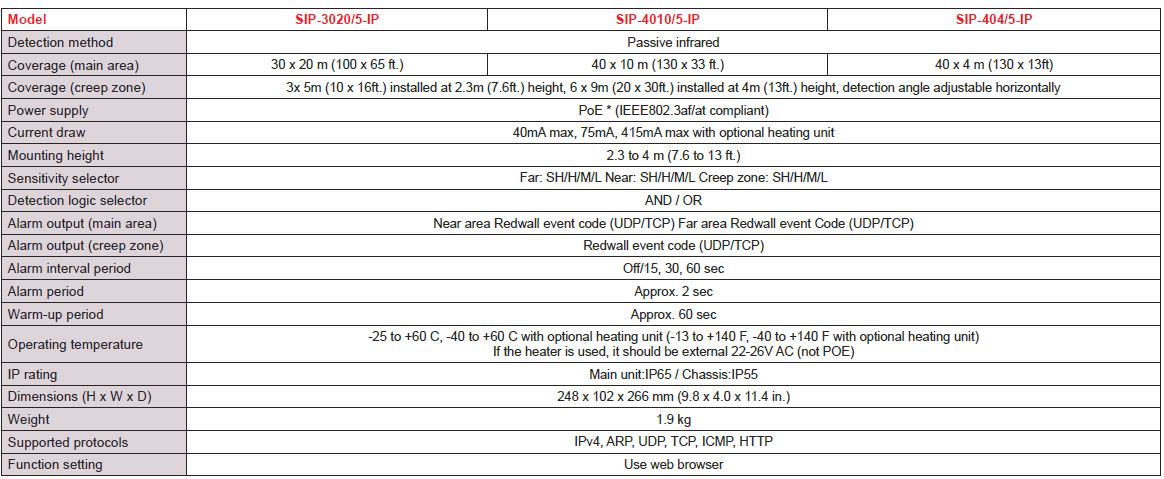 De REDWALL SIP-IP-BOX is een serie) IP/PoE-bewegingsdetectoren met een groot bereik voor buiten die zijn ontworpen om samen te werken met een groot aantal VMS-platforms (Video Management Software), en enkele specifieke IP-camerafabrikanten en PSIM-providers. Het alarm dat wordt gegenereerd door de IP-sensoren activeert een reactie van het beveiligingssysteem. De SIP-404/5-IP heeft een detectiegebied van 40 x 4 m. De detectoren in deze serie hebben 3 alarmuitgangen, 2 onafhankelijke uitgangen voor veraf en nabij en een extra alarmuitgang voor de kruipzone onder aan dedetector (detectiegebied 6 x 9 m). Erg nuttig voor het activeren van videosystemen te activeren en aansturen van PTZ-camera's.