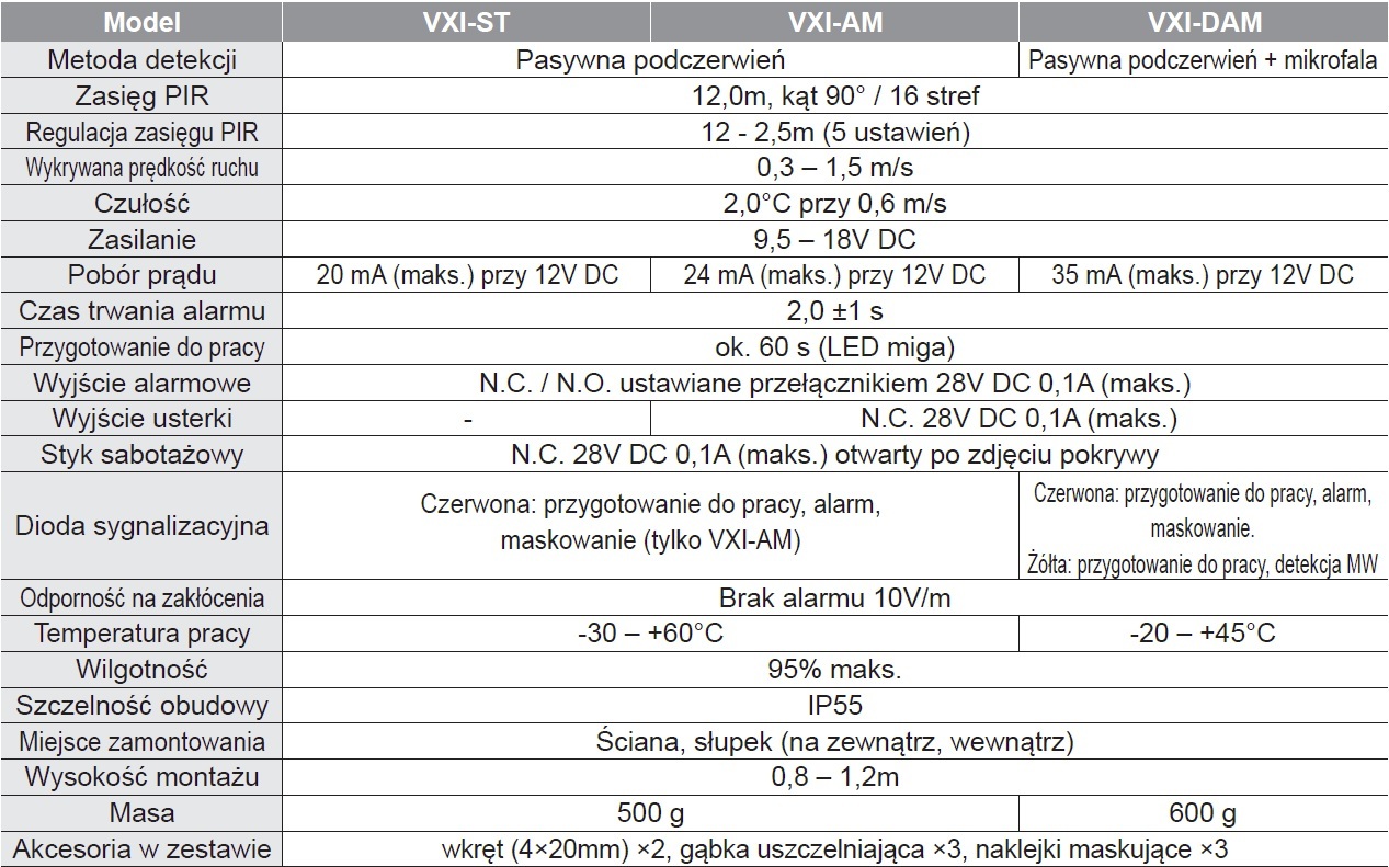 VXI to nasza najlepiej sprzedająca się rodzina montowanych na zewnątrz budynku czujek antywłamaniowych. Zapewnia niezawodne wykrywanie zbliżających się obiektów w promieniu maks. 12 m, w zastosowaniach mieszkalnych i handlowych. Czujkę montuje się na wysokości ok. 1,2 m. Zawiera ona dwie czujki PIR, obejmujące obszar wykrywania dwiema warstwami. Czujka uruchomi alarm tylko, gdy zostaną aktywowane obie warstwy. Czujki VXI są wyposażone w funkcje analizy cyfrowej, która odpowiada za wykluczanie przyczyn fałszywych alarmów. Obudowa jest odporna na warunki pogodowe (klasa szczelności IP55), a opatentowany filtr światła białego (Double Conductive Shielding) ogranicza wpływ światła słonecznego. VXI-AM to model przewodowy z antymaskingiem.