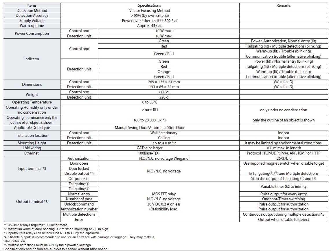 Accurance OV-102 is an anti-tailgating system with human tracking technology and direction-determining capability, for multiple applications. The sensor provides various levels of action in case of tailgating, including “alert/deterrence,” “deterrence/simplified prevention” and “prevention,” according to the security levels customers demand and the situation. The system offers various advanced features, including the Escort Function, which allows entry of a visitor who does not have the authorised credentials needed to enter the secured area, and the external output of images obtained by a detection unit.