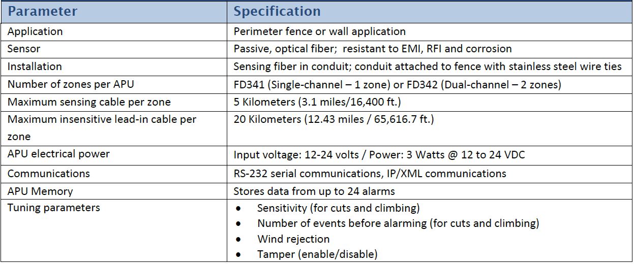 | The FD341 provides single channel operation, users can connect sensor cable from two separate deployment locations.The FD34x series provides intrusion detection system control with communication options that include IP/XML capability. | The FD34x series Digital Signal Processor (DSP) and electronics provides