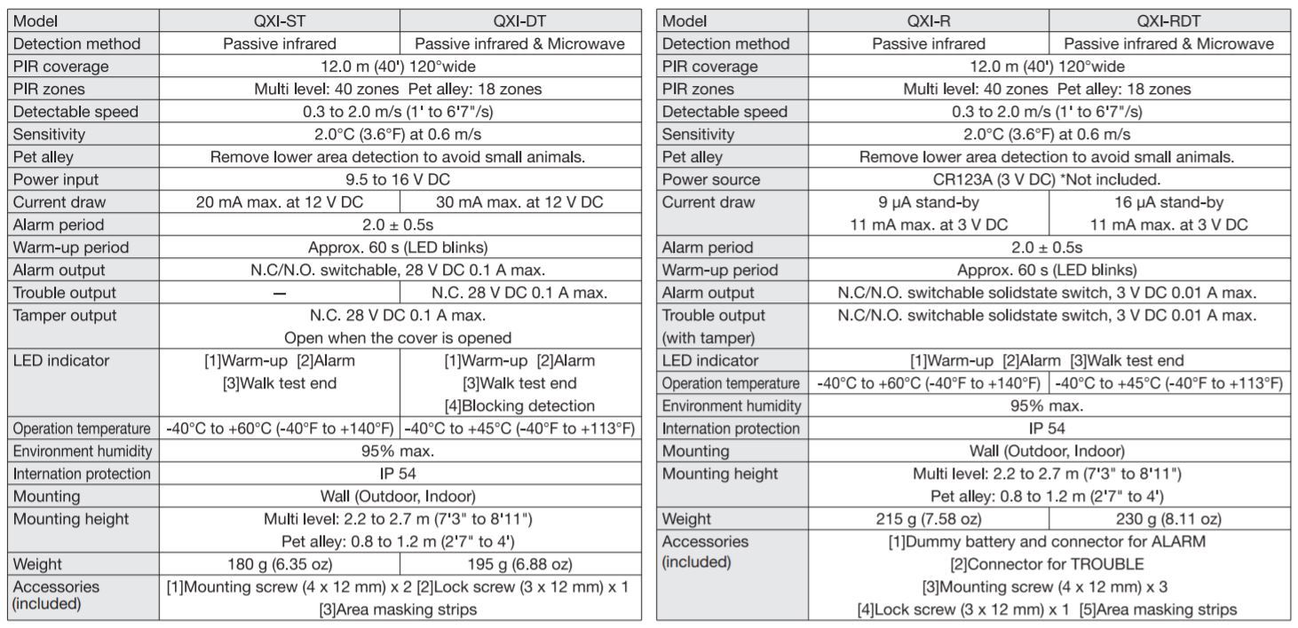 The QX Infinity (QXI) series is a range of outdoor PIRs and dual-technology sensors providing 120° wide and 12m (40ft) detection area, which can be adjusted with the masking strips provided. Sleek and compact, the QXI sensors are small and well suited to any residential or commercial building as they provide reliable, animal tolerant intrusion and motion detection to trigger alarm panel of CCTV camera. QXI-R is the wireless model.